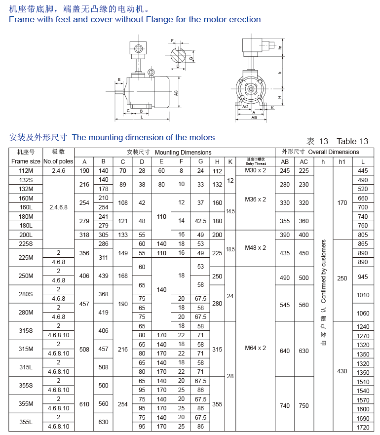 一、概 述 YBF3-112~355风机用隔爆型三相异步电动机是我公司在YBF2系列电动机的基础上结合当前国内外电磁结构、工艺、材料等方面的新技术而开发研制成功的新产品, 具有高效节能、温升裕度大、寿命长、性能好、噪音低、隔爆结构先进、可靠性高、使用维护方便等优点。该系列电动机效率指标符合GB18613-2012《中小型三相异步电动机能效限定值及能效等级》电动机能效3级,其功率等级和安装尺寸符合IEC标准并与YBF2系列电动机相同。 二、结构说明 电动机的隔爆结构具有ExdI Mb、ExdIIAT4 Gb、ExdIIBT4 Gb。电动机主体外壳防护等级为IP55。 电动机的冷却方式为IC411。 电动机绝缘等级为F级,定子绕组温升裕度大、寿命长。 电动机有一个圆柱形轴伸,借联轴器或正齿轮传动。 电动机定子绕组采用高强度聚酯漆包圆铜线,并经VPI真空加压浸漆处理成为一个完整的整体,绕组及绝缘具有良 好的电气、机械、防潮性能及热稳定性。 电动机转子采用铸铝结构,转子经动平衡校验,电动机运转平稳、振动小、噪声低。 电动机定、转子冲片采用高导磁、低损耗优质电工硅钢片,电动机损耗低、效率高。 电动机轴承选用低振动、低噪声轴承,机座号132及以下采用双面密封轴承,在轴伸端装有波形弹簧垫圈,以适度力压靠轴承,有效抑制电动机运转时产生的振动和噪声;机座号160及以上采用内、外盖结构,并在轴承部位采用挡圈轴向固定,有效地防止电动机转子的轴向窜动。 为使电动机安全可靠运行,机座号160~225根据客户要求电动机轴承结构可设置注排油装置,机座号250及以上电动机,预留轴承温度监测传感元件位置。 三、使用条件 海拔:适用在海拔不超过1000米 四、电动机的电气性能见表5~表9 五、电动机结构及安装型式和安装外形尺寸 5.1电动机结构及按装形式本系列电动机的安装方式符合GB997《电机结构及安装形式代号》及IEC60034-7的规定。本系列电动机有5种基本 结构形式: B3-机座带地脚,端盖无凸缘;B5-机座不带地脚、端盖有凸缘;B35-机座带地脚、端盖有凸缘;B14-机座不带地脚、端盖有小凸缘;B34机座带地脚、端盖有小凸缘。 本系列电动机在上述5种基本结构上,可派生15种常用结构及安装形式,其制造范围见表10。结构及安装形式示意图见表11。 5.2电动机接线盒结构 电动机接线盒具有优良的隔爆结构性能和较高的防护等级,具有较大的空腔以便于接线,进线分为橡套电缆,铠装电缆,钢管分布线及防爆挠性管四种。按不同要求,可分别制成一个进线口(适用于电动机直接起动)和两个(进线口使用于电动机Y-Δ起动)。接线盒进线口及适用范围见表12。 六、订货须知 用户在订货时须注明电动机的型号、额定功率、额定电压、额定频率、极数、旋转方向、防爆标志、防护等级、安装方式、工作制、使用环境和工作条件以及配套机械设备的使用要求。本系列电动机可根据用户要求加装定子测温元件、轴承测温元件(只能装于中心高160及160以上电机)、热敏电阻(针对单电压)、加热带(须注明电压)、轴承测温元件并带就地显示仪(只能装于中心高160及160以上电机),如需要请在订货时注明。 样本提供的技术数据和安装尺寸仅供用户订货时参考,用户订货时以我厂提供的外形图为准。 随着技术的不断进步,数据可能有所变动,恕不另行通知。